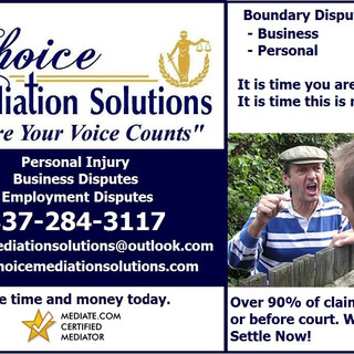 Are you having to deal with a neighbor at work or at home about boundary lines or complaints of what you should or should not be able to do at your own home. Tired of the comments, letters, looks.. Mediation can assist you. Choice Mediation Solutions will get the lines of communication open and in action. Compromise is key Communication is a must! DID YOU KNOW YOU CAN TAKE CARE OF THIS PROCESS WITH OR WITHOUT AN ATTORNEY? DID YOU KNOW IF YOU HAVE ALREADY HIRED AN ATTORNEY....WE CAN ASSIST BOTH OF YOU TO GET THE CASES RESOLVED AND SETTLED NOW - VERSES WAITING??? Choice Mediation Solutions can assist you. If you are in the middle of a law suit and would like to wrap things up. --- Contact Choice Mediation Solutions. If you have not yet filed a law suit...you on the fence if you want to or not... --- Contact Choice Mediation Solutions. One of our highly qualified Mediators will assist you today. We will work one on one with you and/ or your attorney and get a mediation session set for you. You will get to meet one on one with the opposing side, neighbor, so BOTH " Decision Makers" --- (You and Your Neighbor) Can Confirm with a Legal Binding Agreement, & Compromise Now...Saving you...TIME & MONEY. A Mediator Serves as a neutral third party that will assist all sides to resolve right away instead of waiting months, or years to resolve waiting for your turn in court. Over 95 % of cases settle before court or when you go to court...this process takes from your bottom line. Cases of this sort that went to court cost on average 1000.00 or more and you have to wait your turn to be heard. In most cases your attorney speaks for you and you never get a true say in what you really want or need...not because of your attorney...Just because..Typically the court request the facts..and the judge or jury will determine your outcome. This sometimes takes months or years leaving you to battle with your neighbor all this time risking escalation. Mediation allows you to both meet now...resolve now...have closure and move forward. It not only saves you time...Inquire about our flat rates for these type cases to save you money as well. In most Boundary cases we know you not typically out to seek a settlement . You are mainly seeking results. So you certainly to not want to pay allot to resolve and move forward. Choice Mediation Solutions " Where Your Voice Counts" 337-284-3117 www.choicemediationsolutions.com